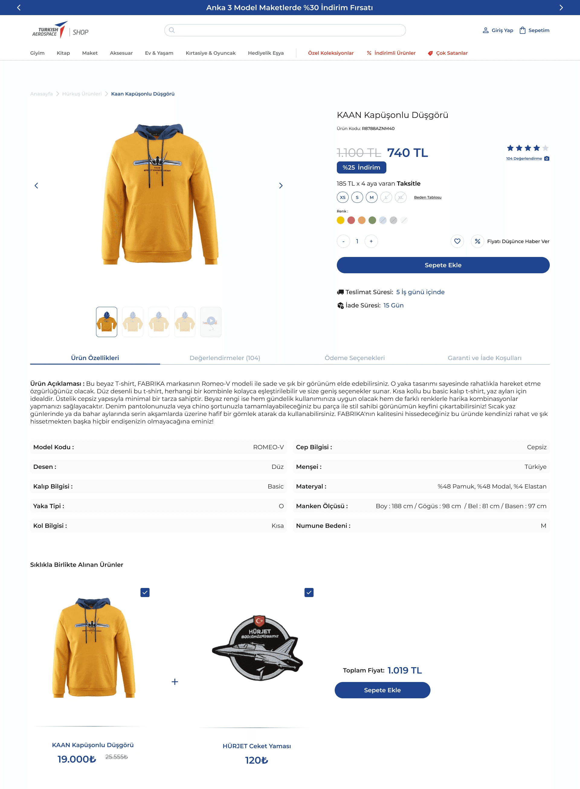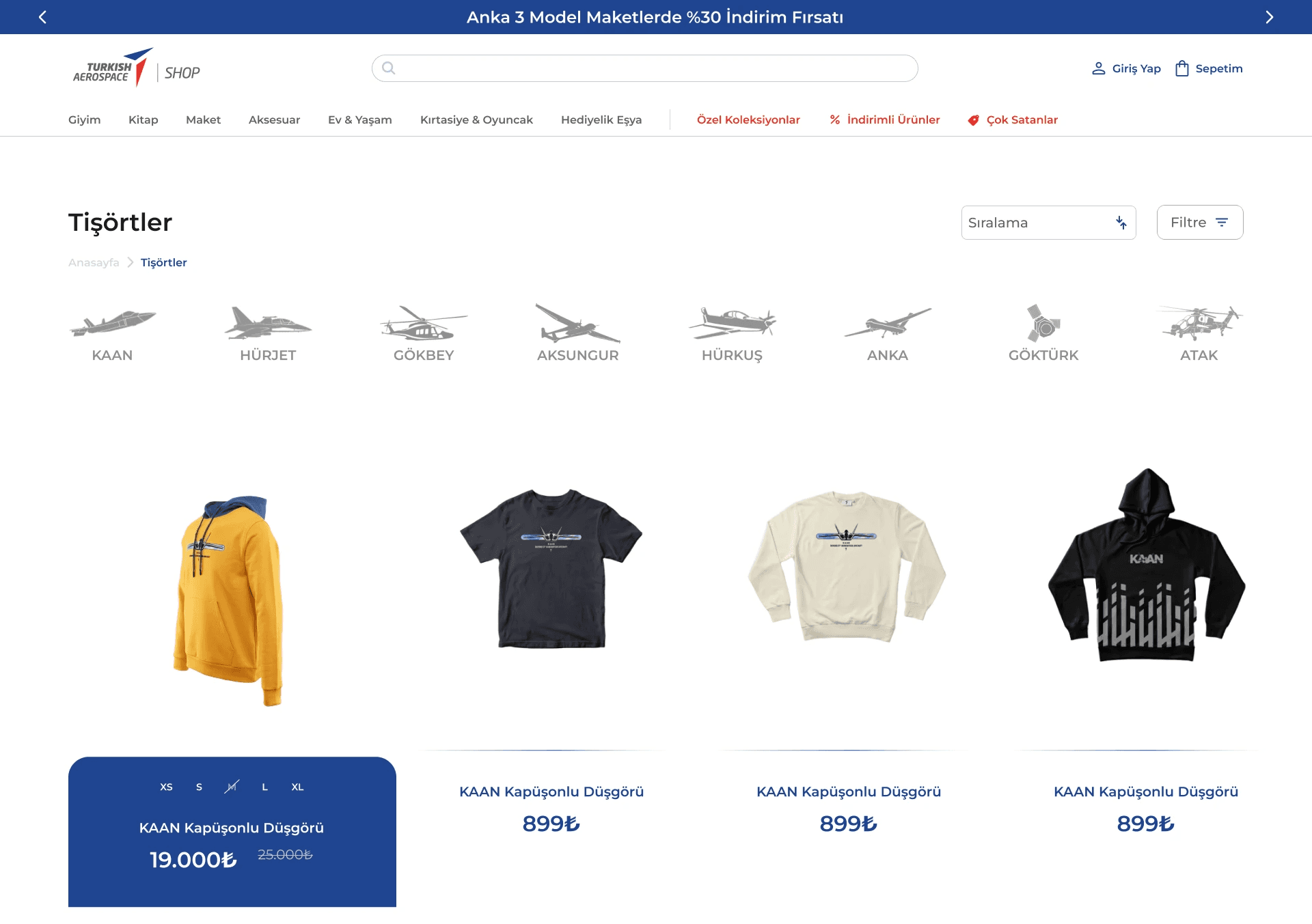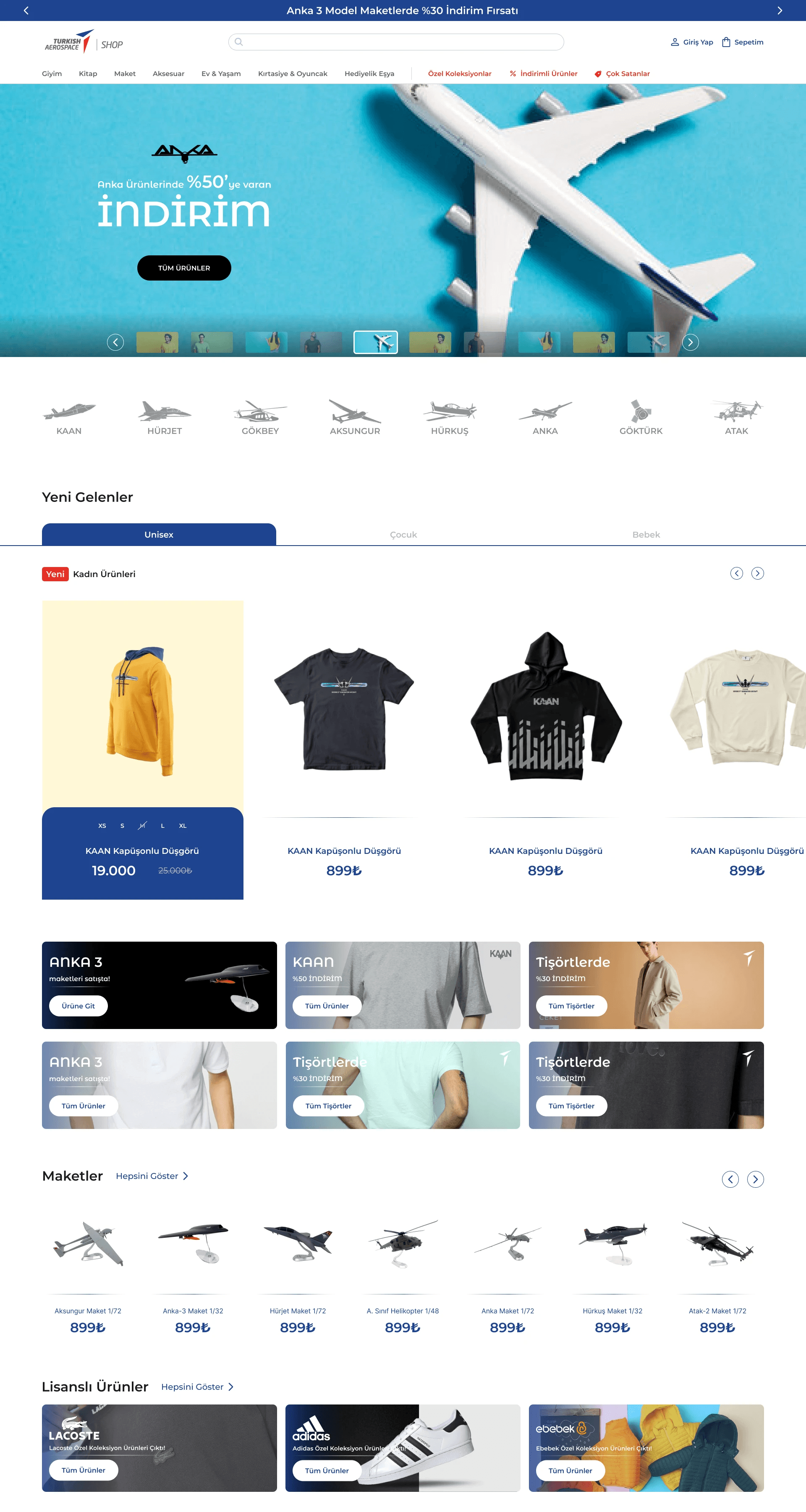 TUSAŞShop is an e-commerce platform representing the corporate brand value of Turkish Aerospace Industries, offering aviation-themed licensed products and collections. The goal of this project was to reflect the brand’s aviation identity through a modern and intuitive interface, while enabling users to discover products more quickly, filter more efficiently, and complete purchases with less friction.