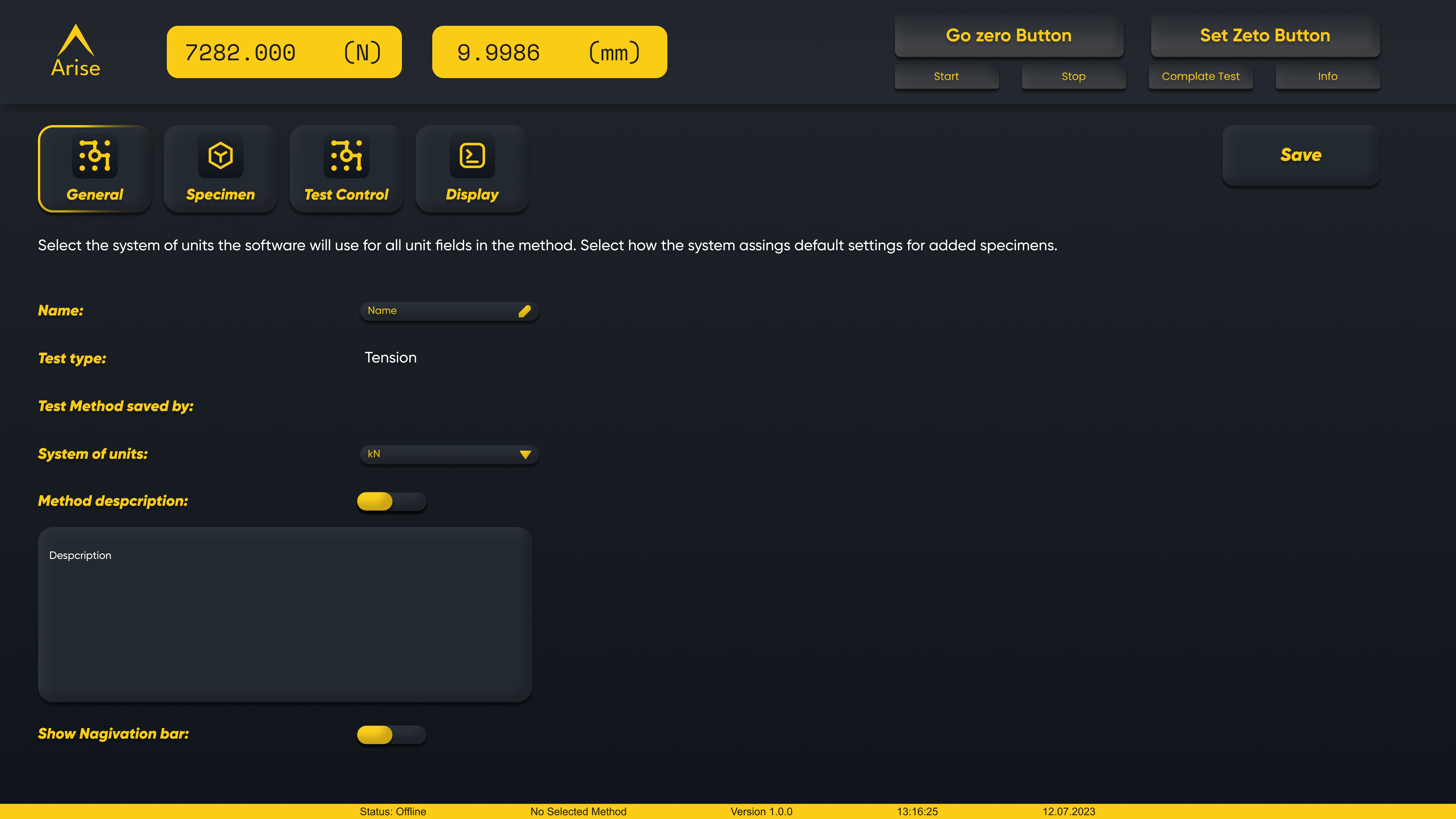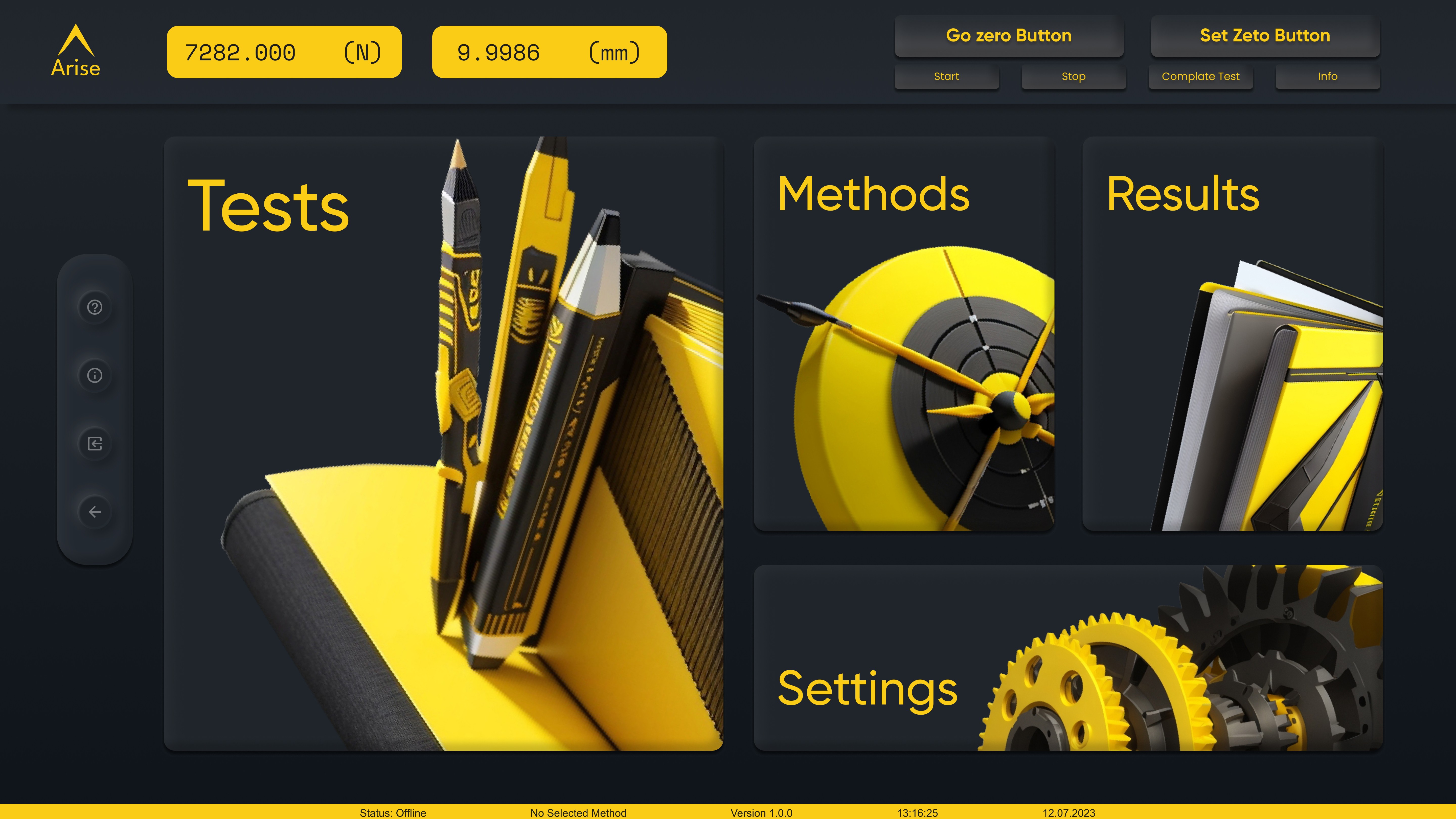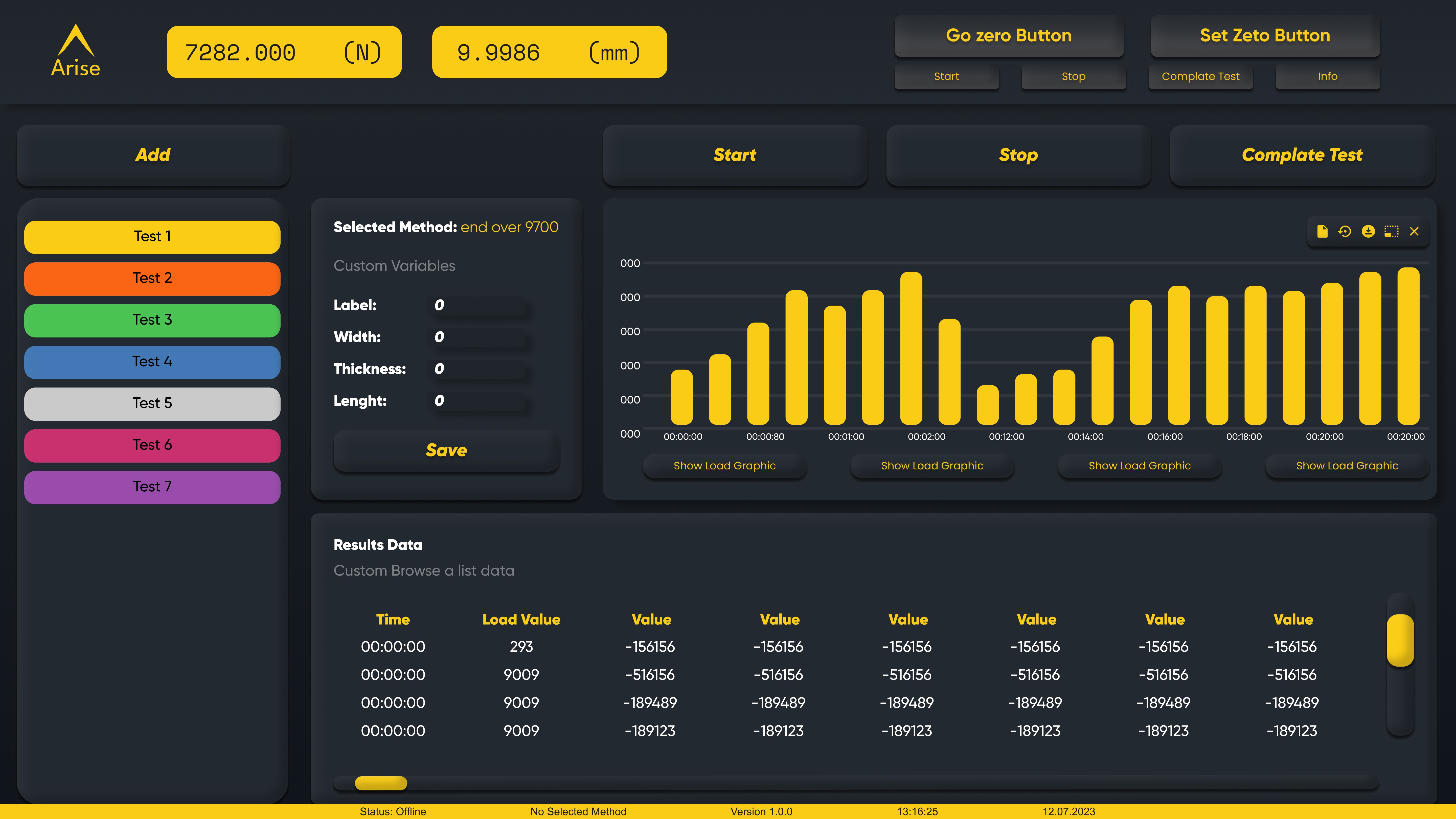 Critical actions (“Start Test”, “Go Zero”, “Complete Test”) were protected with warning dialogs.
